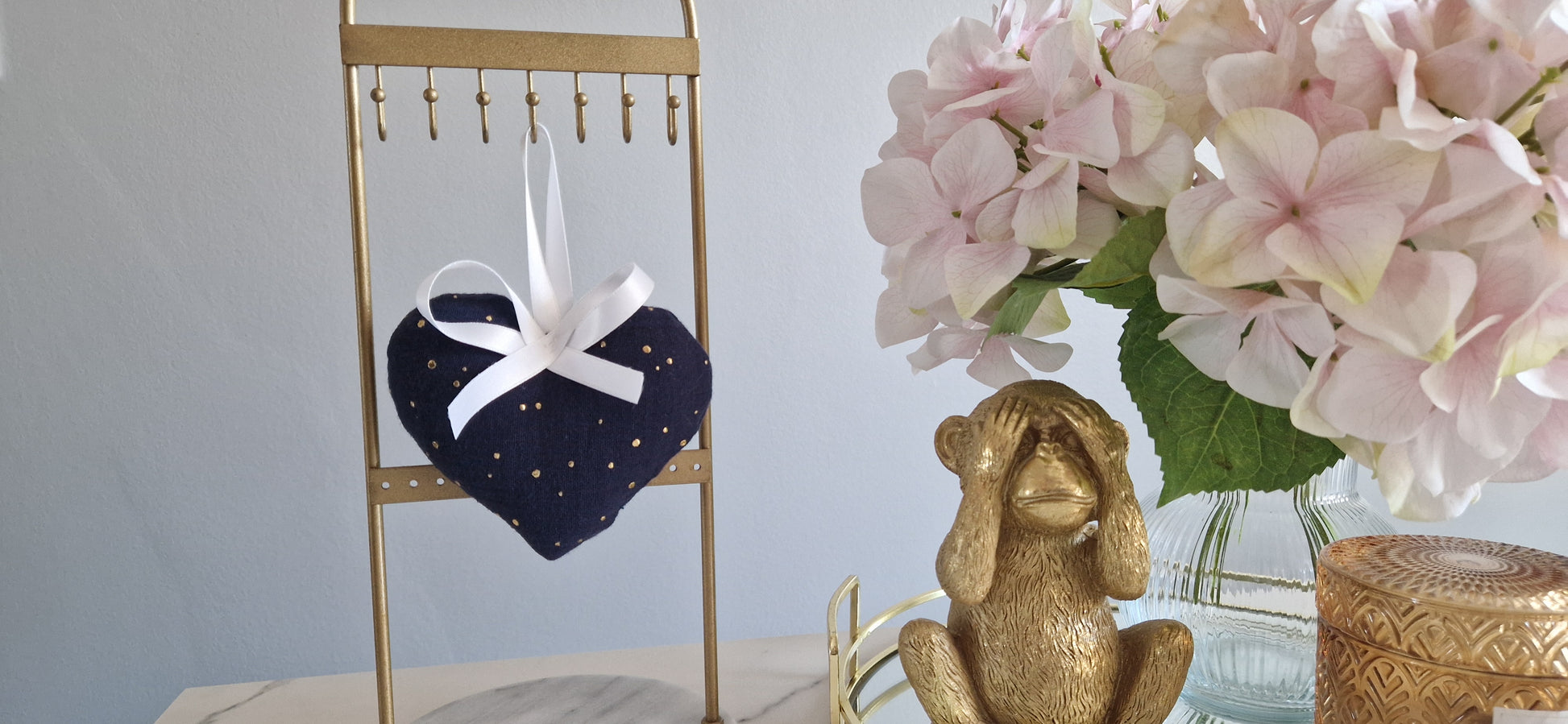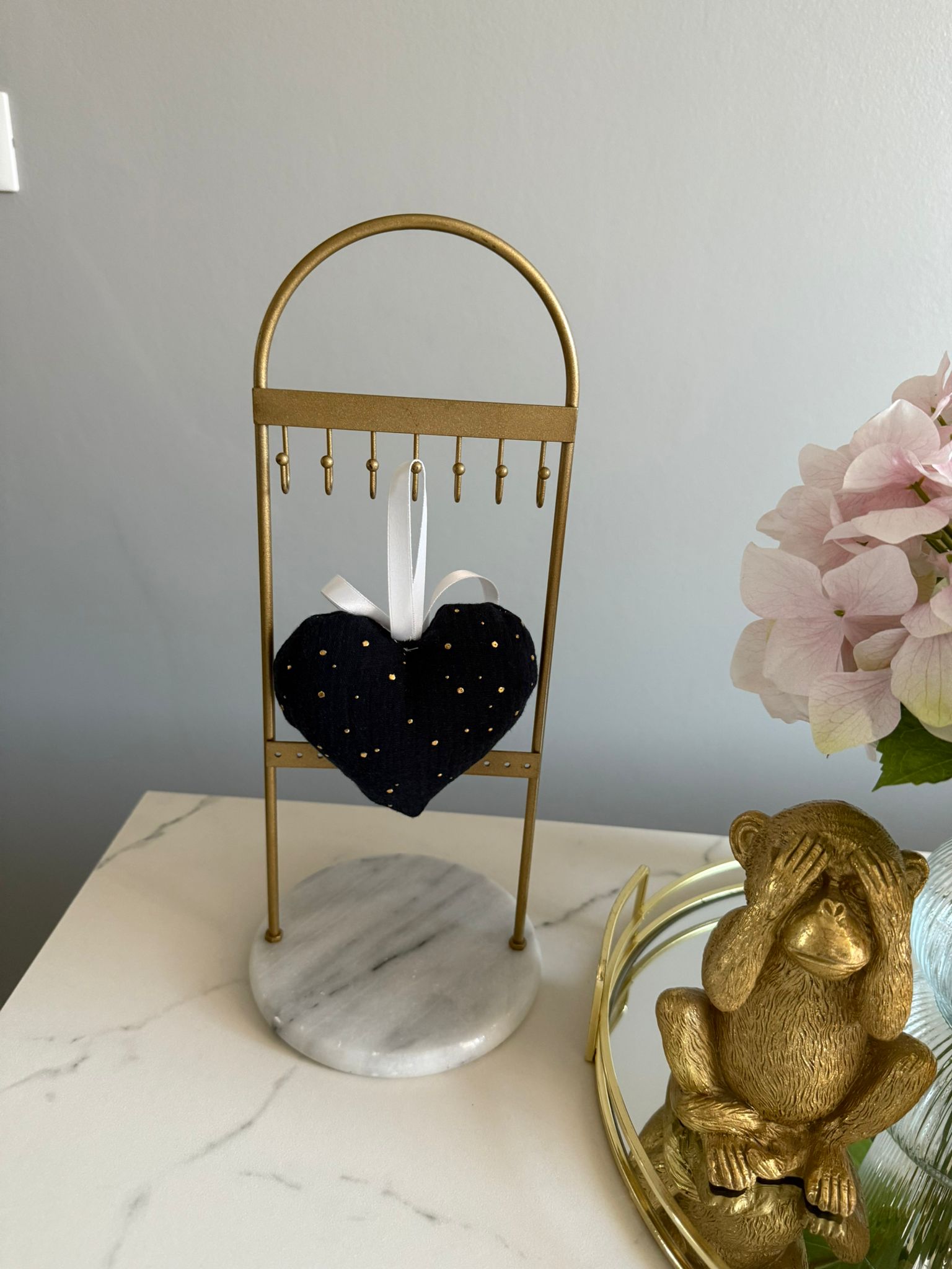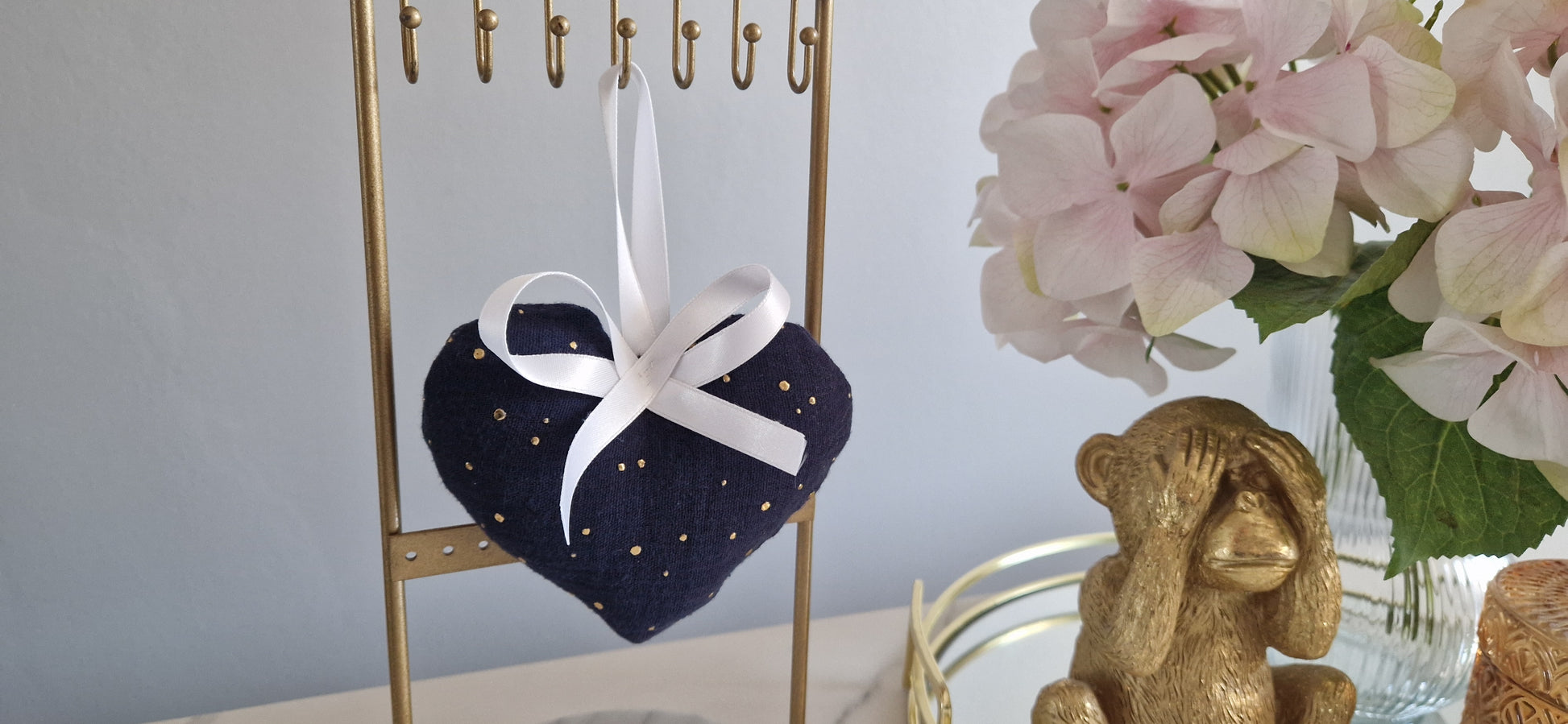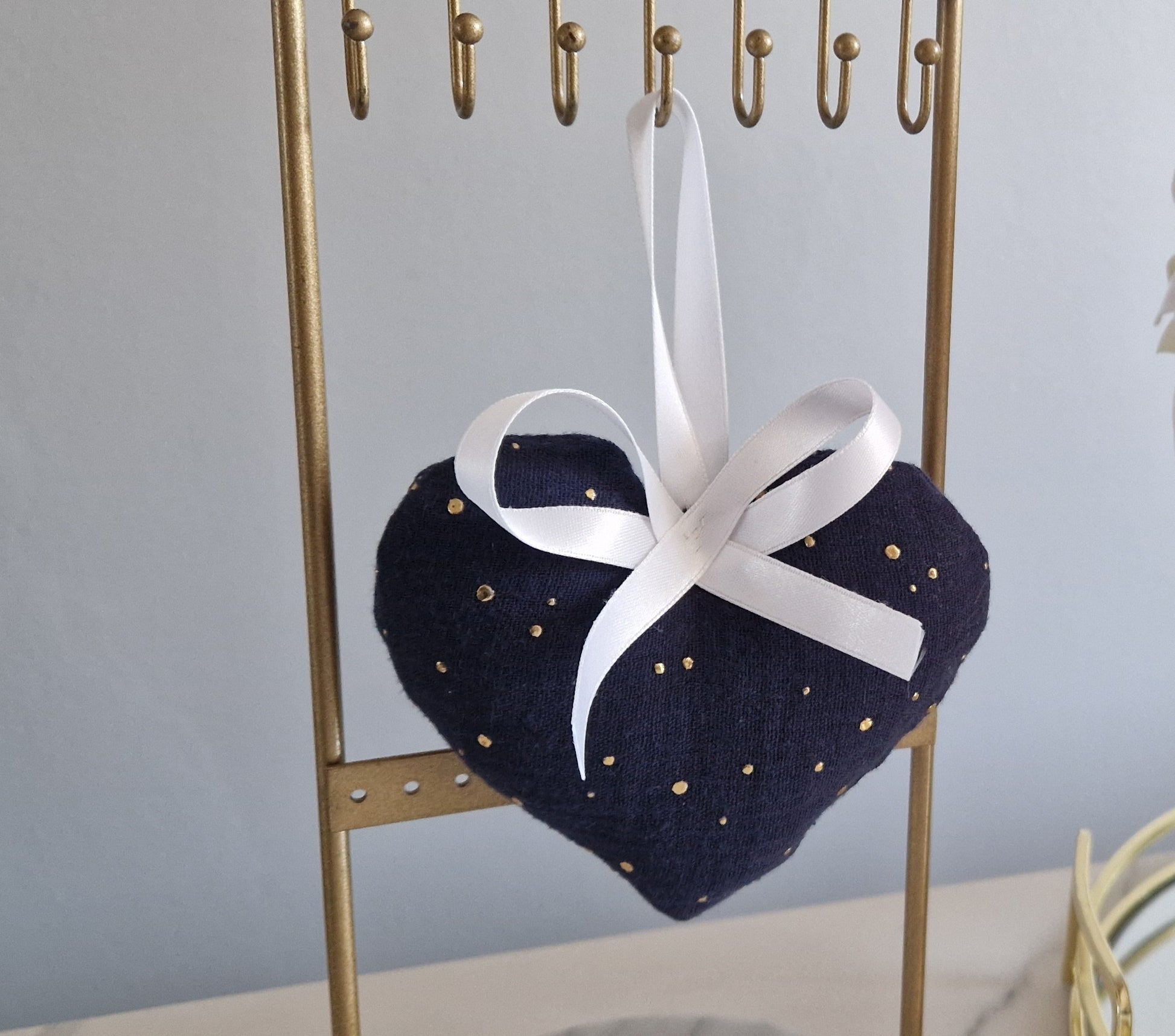 Un dolce dettaglio che porta un tocco di eleganza in ogni ambiente. Realizzato a mano in tessuto blu con pois dorati, questo cuore imbottito misura 11 x 9 cm ed è impreziosito da un fiocco in raso bianco.