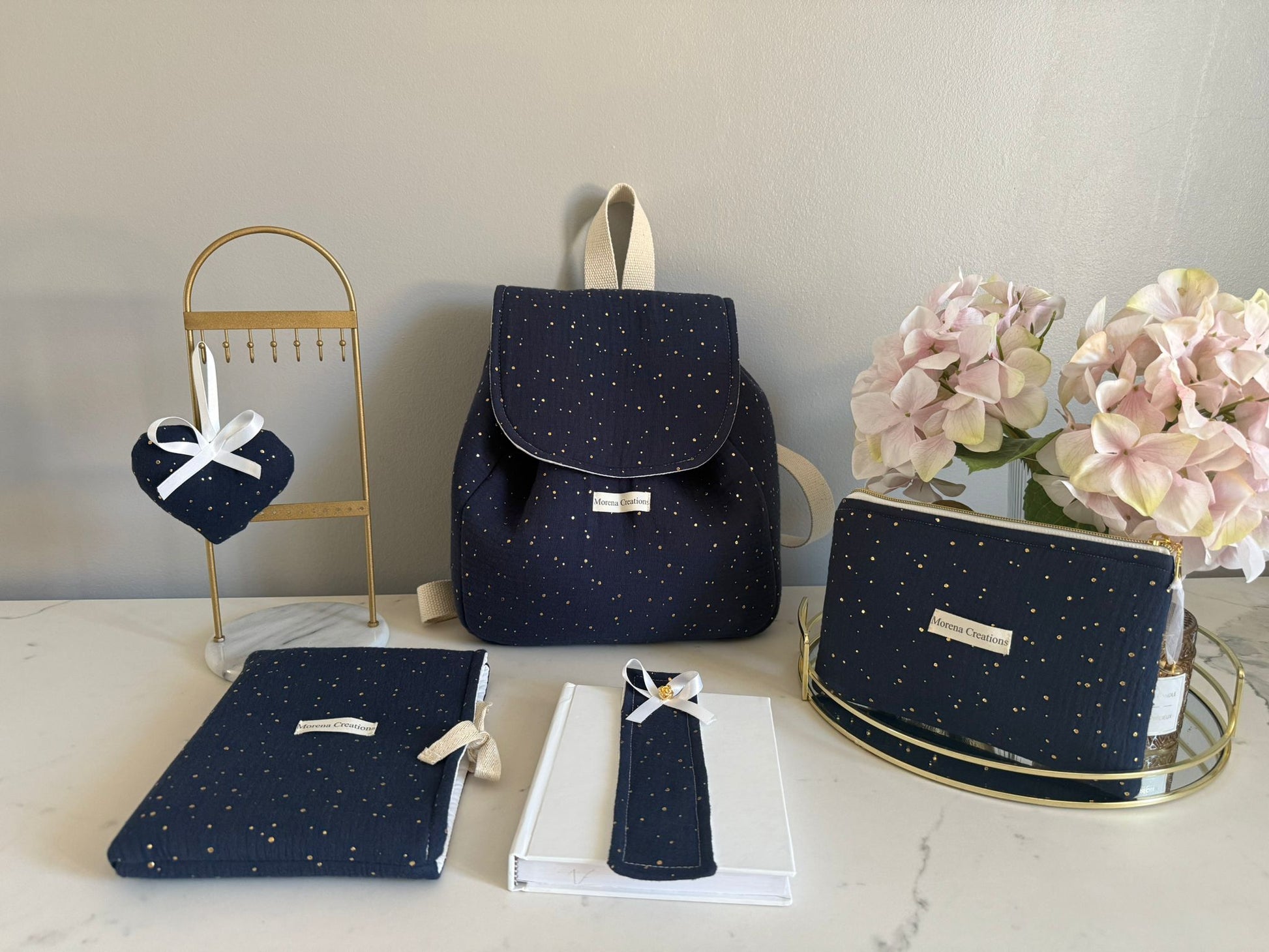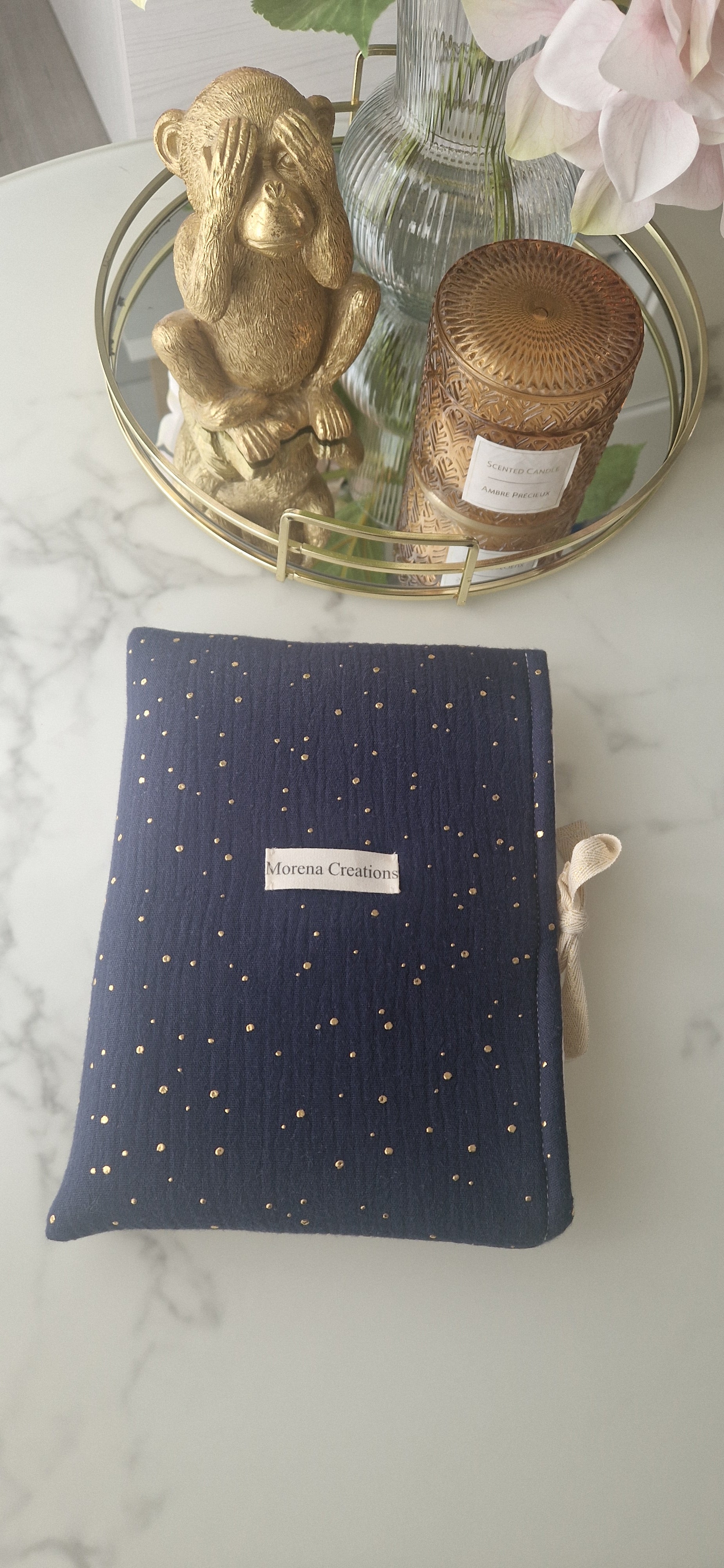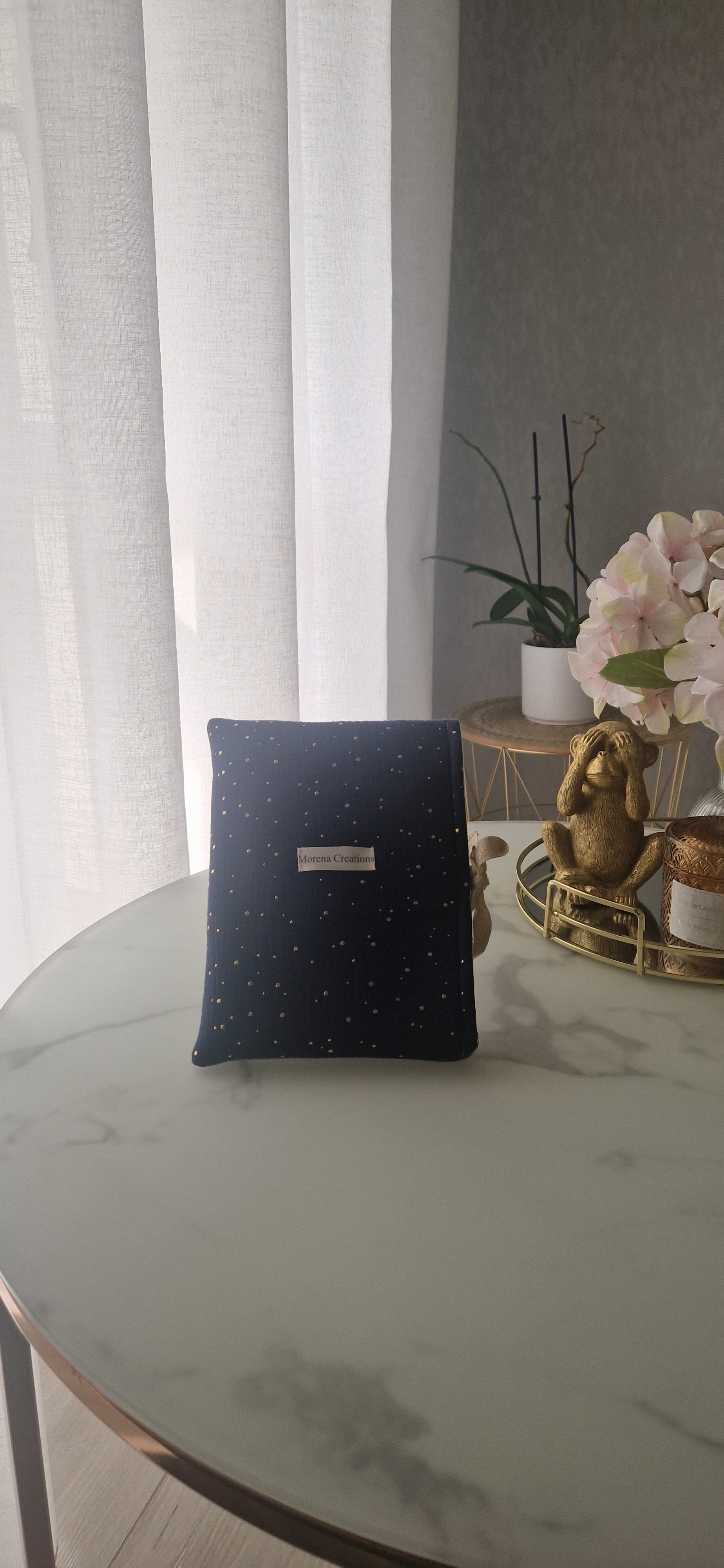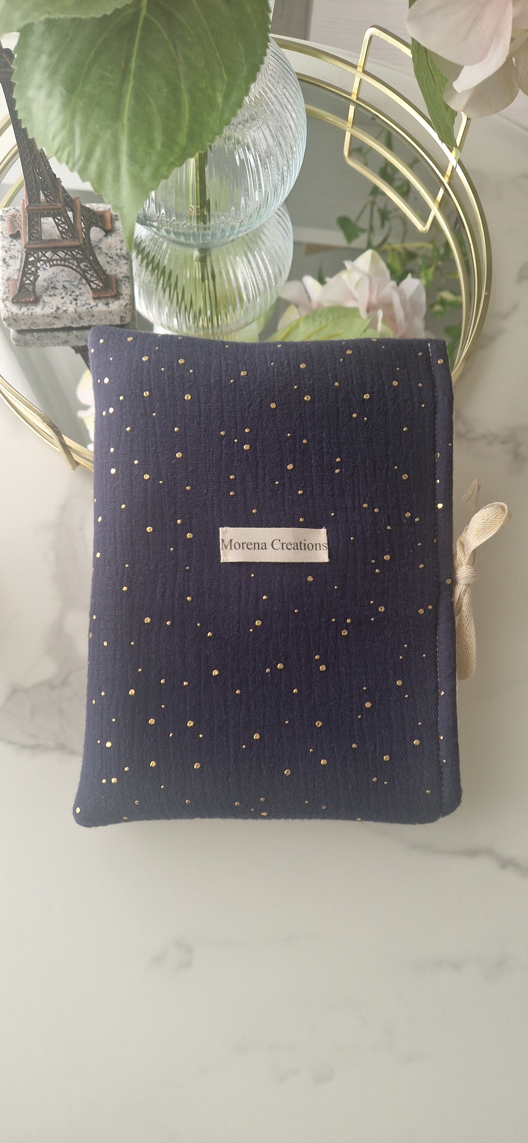 Un accessorio elegante e pratico, realizzato a mano in tessuto blu con delicati pois dorati. L’interno è foderato in cotone, morbido e resistente, pensato per proteggere i tuoi libri da graffi e usura.